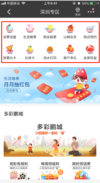 用户只需打开招商银行手机APP,进入深圳专区,无需任何录入,即可在线查询个人社保信息、打印个人流水、进行网点预约、以及办理日常生活缴费等业务。