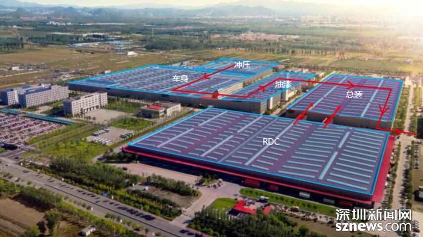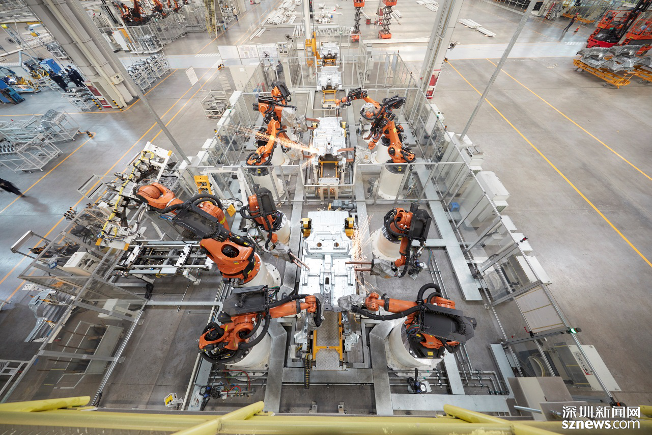 车身车间总占地面积9.9万㎡,采用互联机器人、柔性NC定位系统、柔性夹具切换系统、自动化输送系统,标准化工艺体系、三层环网智能管理系统、国际安全标准,主线自动化率95%;采用柔性智能生产线,在同一条生产线可完成8个不同的车型无节拍损失自动切换和混线生产。