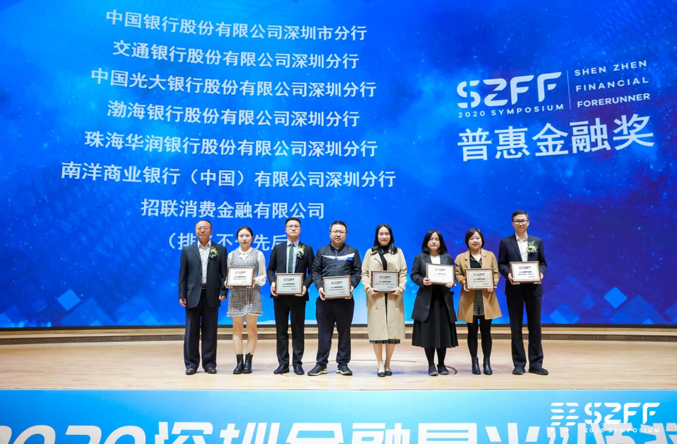 深圳新闻网·见圳客户端2020年12月30日讯 日前,在由凤凰网广东、深圳市金融稳定发展研究院、深圳市银行业协会、深圳市保险同业公会携手举办“2020深圳金融星光”颁奖盛典暨“新担当·深圳金融业先行示范创新发展”研讨会(简称2020SZFF大会)活动中,光大银行深圳分行摘得2020杰出贡献奖、普惠金融奖、最佳银行服务奖三项大奖,深圳分行营业部理财经理彭雨、龙华民塘支行个贷经理马小双、信用卡业务部产品经理鹿含、公司业务管理部副总经理赵明、渠道管理/消费者权益保护部总经理楼蓉、办公室品牌经理李昕、办公室品牌经理沈婷等荣获2020优秀星光人物奖和优秀通讯员荣誉称号。