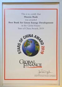 11月11日,在美国《环球金融》杂志2019年“中国之星”颁奖仪式上,华夏银行凭借绿色金融支持清洁能源发展的突出表现,再次获得了“最佳绿色能源开发银行奖”。