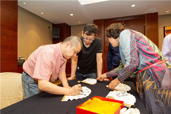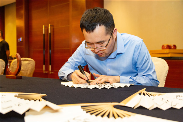 闭幕式上,嘉宾为围棋爱好者折扇签名。