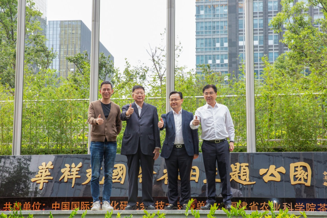 全国人大常委会原委员、福建省人大常委会原副主任、海峡两岸茶业交流协会高级顾问庄先(左二),中国工程院院士、湖南农业大学学术委员会主任刘仲华(右二),著名财经作家、华祥苑国货推荐官吴晓波(左一),华祥苑茶业股份有限公司董事长肖文华(右一)共同为主题公园开园揭幕。为庆贺国际茶日而建的主题公园——521国际茶日主题公园,盛大开园!世界茶树在这里汇聚,华祥苑八大庄园的茶树于此展现,学习堂里有对中国茶发展的殷殷嘱托。中国茶文化的世界坐标,中国传统文化的世界表达,再添新章。