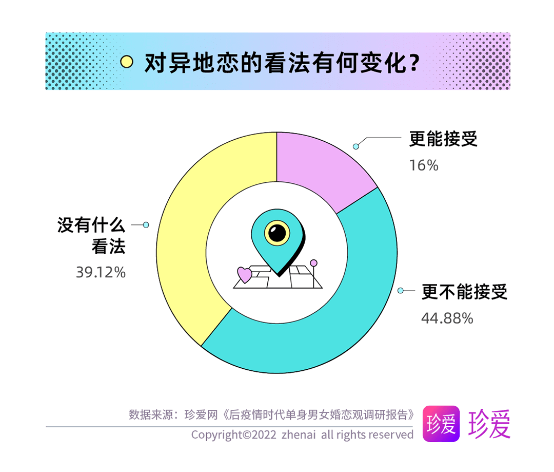 疫情期间的所见所闻使得单身青年们对恋爱模式有了不同的看法,调查发现,近五成(44.88%)的人表示更不能接受异地恋了;仅16%的人表示更能接受。女性(50.8%)比男性(30.64%)更不能接受异地恋。