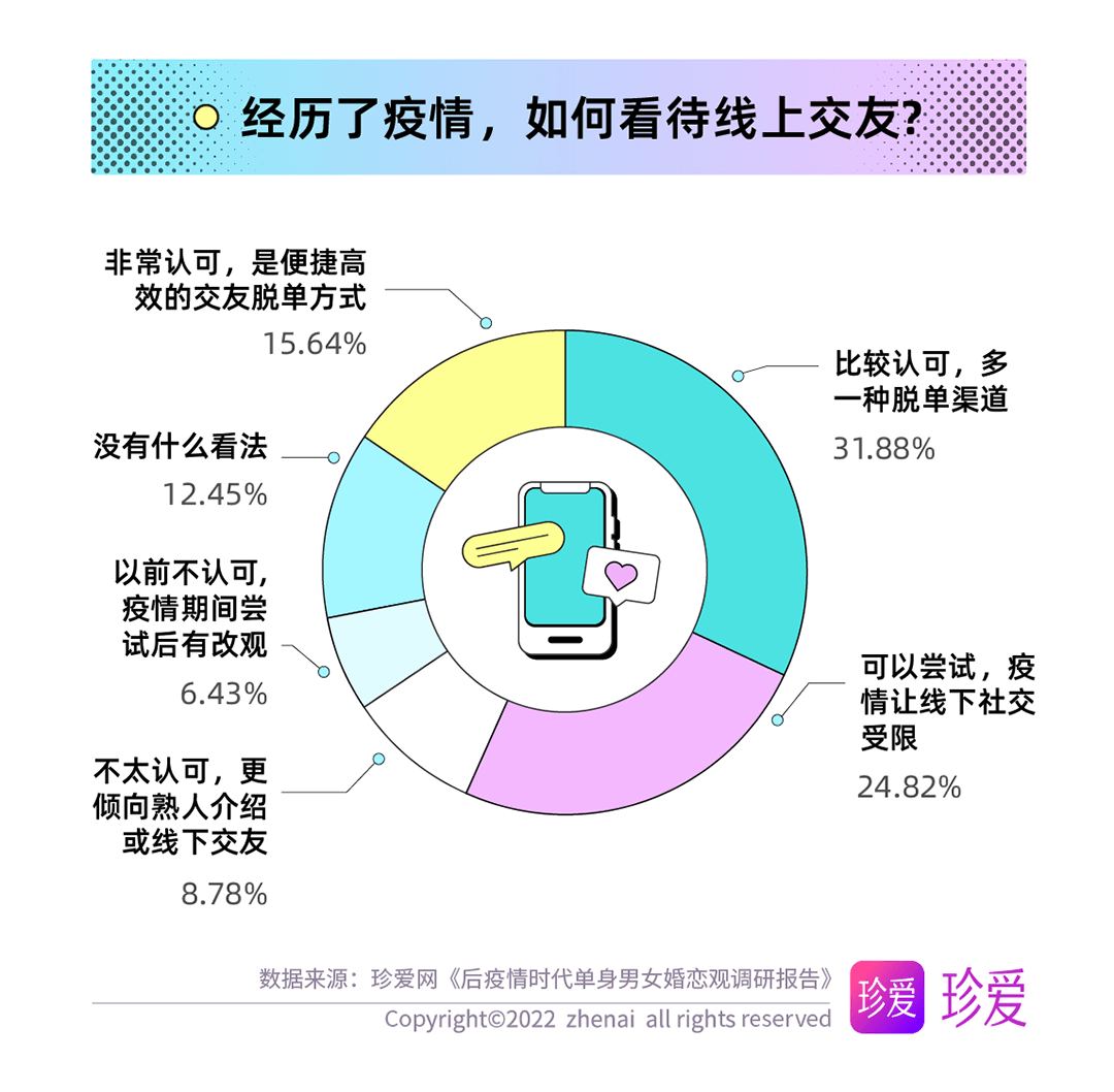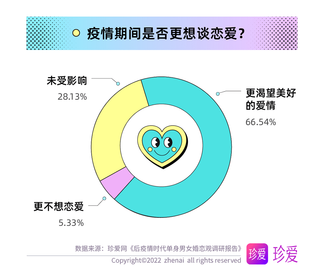 读特客户端·深圳新闻网2022年6月14日讯(记者 叶梅)疫情让人们的生活状态、工作方式和个人习惯都发生了显著变化,而对单身人群而言,疫情三年他们对感情的态度又有哪些改变?现在的他们如何看待亲密关系?珍爱网聚焦后疫情时代单身人群的婚恋观发起调研,探究疫情期间单身人群在恋爱期待、择偶标准、脱单难度等方面的变化。本次调研共回收问卷9862份。