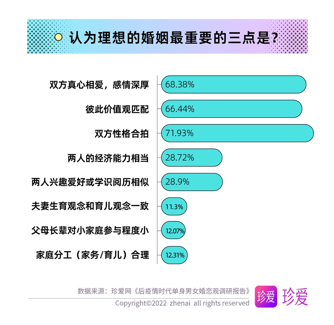 经历过疫情后,居家期间的家庭生活或他人的故事也令单身青年们对婚姻有了新的理解,调查显示,理想的婚姻最重要的因素为彼此性格合拍(71.93%),高于双方真心相爱(68.38%)和两人的价值观匹配(66.44%)。