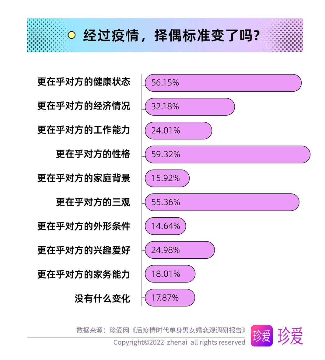 人们的生活方式和心态因疫情影响有或多或少的改变,而单身青年们的择偶标准也在发生着变化,调查显示,经历过疫情,单身青年们更在乎的择偶条件包括对方的性格(59.32%)、健康状态(56.15%)和三观(55.36%),对方的经济情况、兴趣爱好、工作能力以及家务能力也是考量的重要标准。