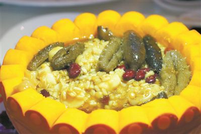 时常在宴席中作为粤菜上品出现的南瓜盅,里面不一定放排骨。这款辽参南瓜盅加花胶仔,是地地道道的养生菜式,兼具滋补效果和药用价值的辽参与花胶“联姻”。
