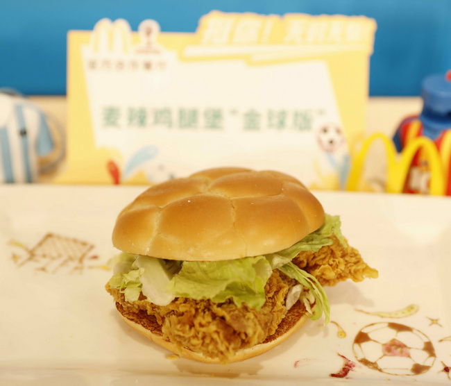 麦当劳中国最受欢迎的汉堡单品——麦辣鸡腿汉堡,在FIFA世界杯期间摇身一变“金球版”,盖上足球形状堡顶,FIFA世界杯期间10元限时特价