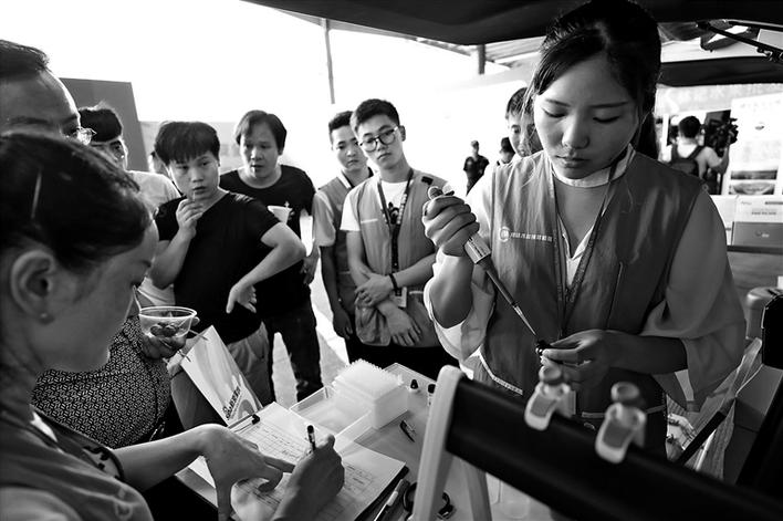 7月17日,深圳食品安全宣传周启动仪式现场开展食品快检。