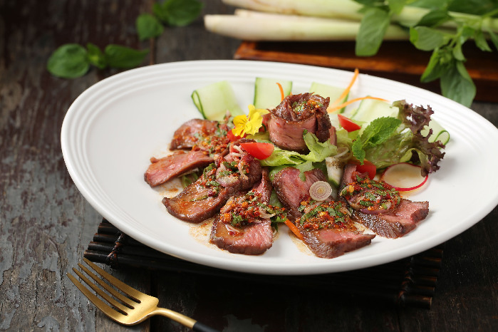 牛肉被贴心地切成小块,以辣椒醬、檸檬汁、魚露、香茅、蒜頭、蠔油等調味料先醃漬入味,煎至表皮微焦後再烘烤,微透着肉粉色就知道多鲜嫩又不失咬勁,微辣帶酸的滋味,令人印象深刻。