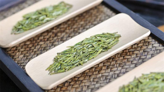 君山银针:外形芽头肥壮挺直、匀齐,满披茸毛,色泽金黄光亮,称“金镶玉”;内质香气清鲜,汤色浅黄,滋味甜爽。