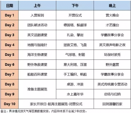 第六天,孩子们会在实景演练下学习野外急救、SOS等相关知识,学会沉着冷静地面对应急情况,尊重生命;在专业教练的陪护下,他们将挑战浮潜,探索水下的神奇世界;夜晚,孩子们将一起露营野外,亲近自然。