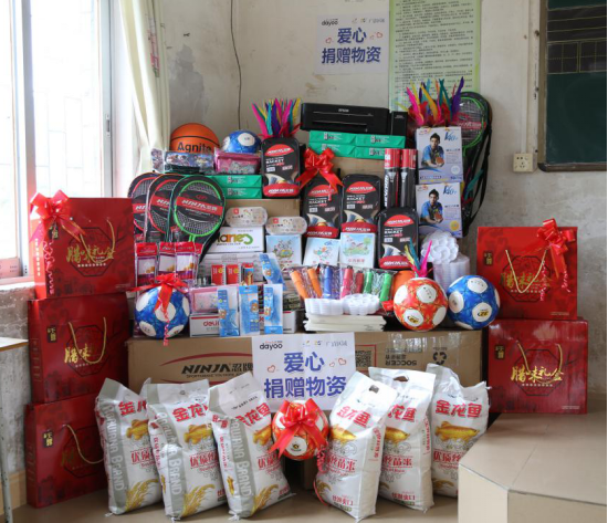 在捐赠仪式上,洋洋公益团队为横槎小学的师生们送上篮球、足球、羽毛球、作业本、铅笔、橡皮檫、文具盒、打印机等文体用品和教学用具,以及大米、腊肠等生活物资。横槎小学谢校长代表学校对爱心团队一行表示感谢,并将锦旗和学生用心勾勒的美术作品回赠给碧桂园集团广清区域、广州日报大洋网等爱心代表。