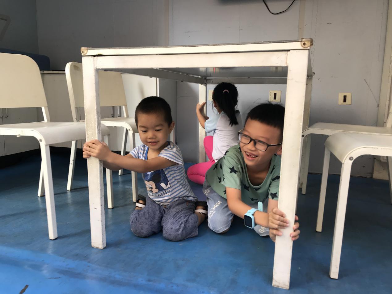 儿童平安训练营活动共有5个版块,分别是动感地带、火眼金睛、铁壁钢手、浮力盔甲、应急包。动感地带活动版块的主体是地震体验平台,通过安全教育车的地震体验功能,社区居民成功学会地震躲避知识要点:规避易倒塌、易破碎、已坠落三类物品;桌下/床下躲避跪、躲、抓三大要点。浮力盔甲是当身边发生溺水或者存在溺水隐患时,可以利用身边常用的物品比如矿泉水瓶和衣服制作紧急救生衣。铁壁钢手是灾害发生、救援难以及时到达情况下,利用身边的物品,对手臂骨折者进行简易包扎。火眼金睛是在许多大地震、火灾和意外伤害中,教会学生认识一些室内、室外的常见安全隐患。