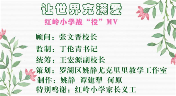 经过学校老师、家长们的共同努力,3月23日,全长6分零6秒的红岭小学战疫MV《让世界充满爱》顺利完成。该片通过红岭小学微信公众号首发,目前,已在深圳晚报、晶报、深圳新闻网等多家主流媒体平台传播。