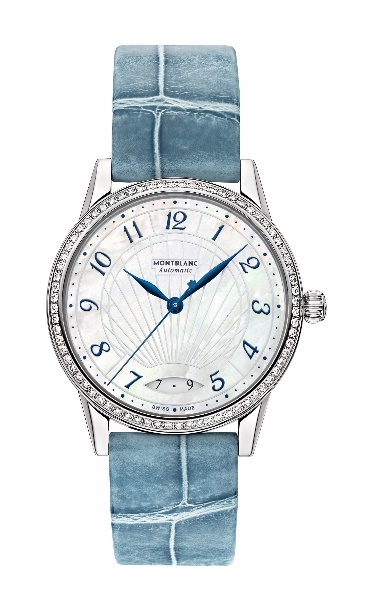 秦岚佩戴万宝龙宝曦系列日历自动上链腕表(天空蓝表带34毫米)