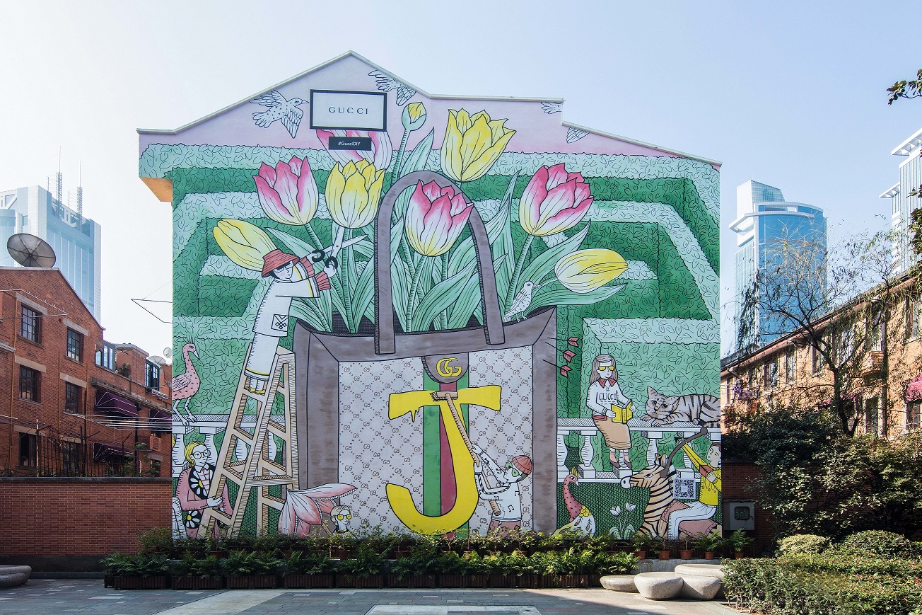 多次与古驰进行合作的美国插画家Jayde Fish,此番受邀为上海丰盛里及香港兰桂坊的艺术墙进行创作。她的作品曾出现在2017春夏系列及佛罗伦萨古驰花园内,风格细腻且极富想象力。她将全新的DIY主题艺术墙绘制成花园,当中巨型的Ophidia手袋(上面饰有她的名字首字母J)与画面中身着古驰时装的微型人物相映成趣,形成童话般的氛围。