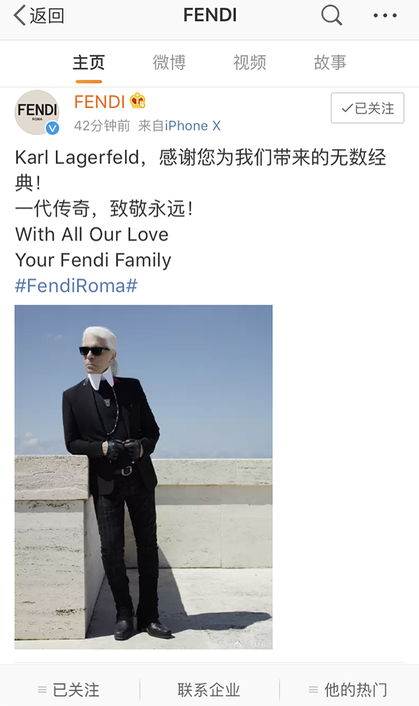 香奈儿执行总裁Alain Wertheimer在讣告中怀念道:“卡尔·拉格斐以其创意才华、慷慨精神和敏锐过人的直觉领先于时代,极大地促进香奈儿品牌在全球范围内大获成功。”Fendi品牌官方微博昨晚发声,“Karl Lagerfeld,感谢您为我们带来的无数经典!一代传奇,致敬永远!”
