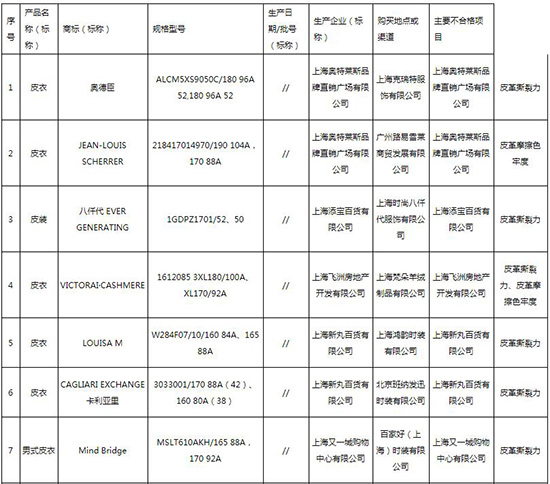 2018年上海市皮革服装产品质量监督抽查不合格产品
