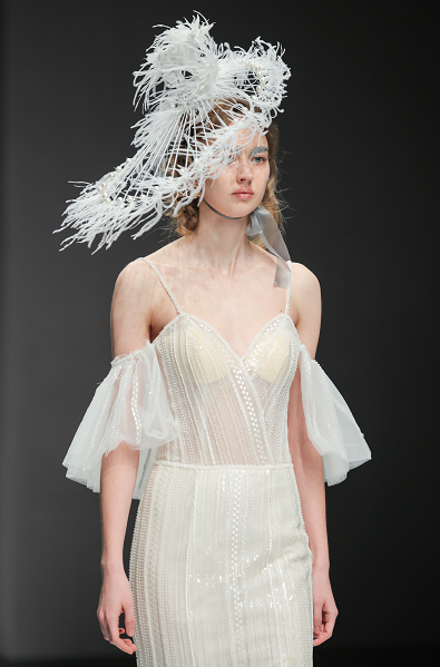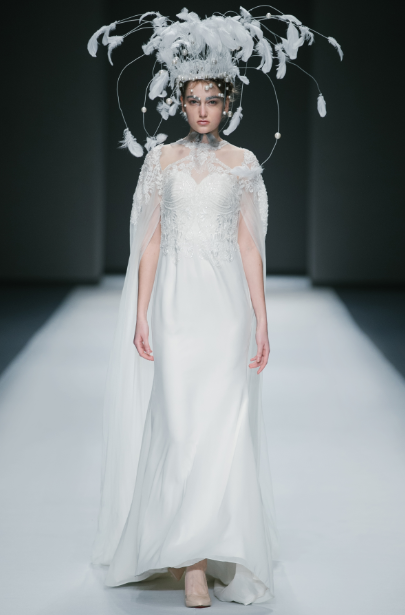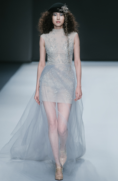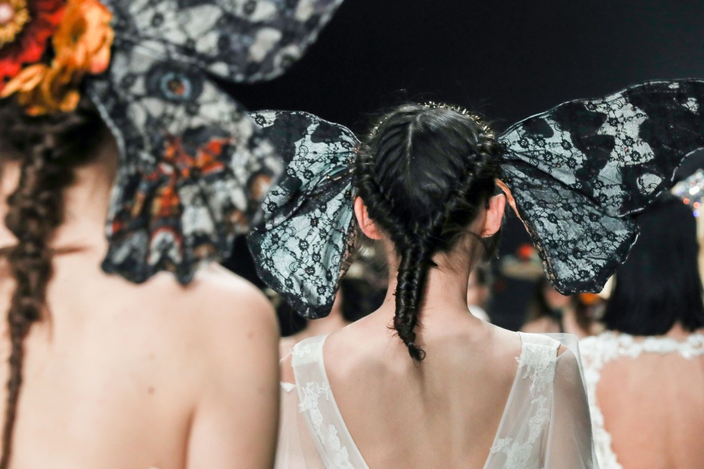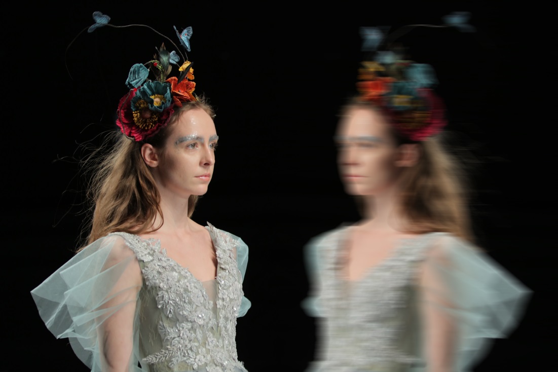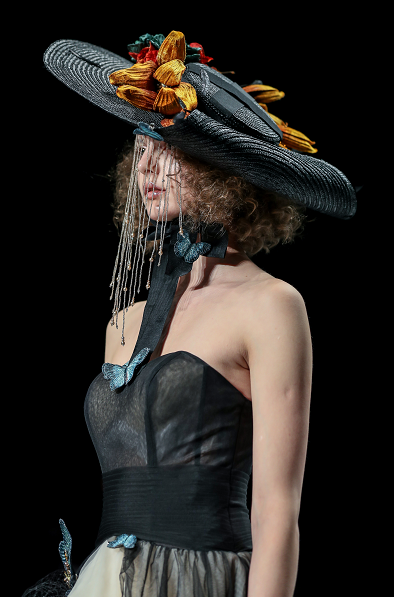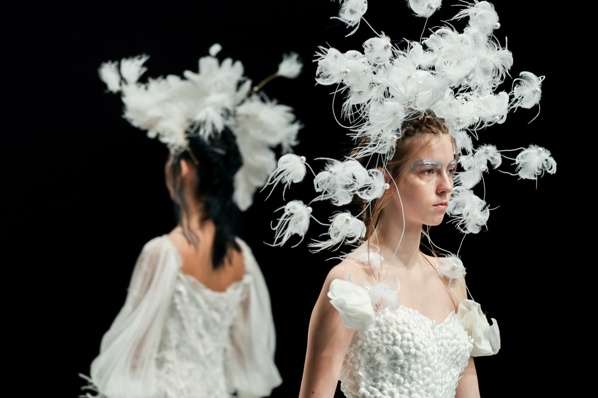 绚烂细腻的串珠演绎初生的朦胧姿态,凋谢的花朵蜕变新生为奇花异草,秀场深处,迷雾重重的神秘意境,模特头戴奇花配饰款款而行,夸张而妖治的花瓣,延伸成夸张的发饰,诉说着浪漫迷人的故事。