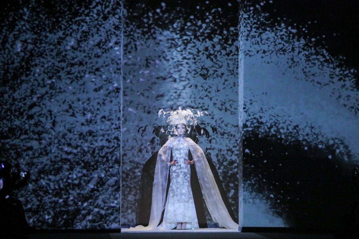 2019 She’ s A/W主题大秀在一片3 D叠影的影像中拉开帷幕,闯入次元时空,万物入眼,混沌一片,新生的异蝶面对一切,既是危险亦是奇遇…在洁净的纯白中寻找力量,纯净的羽毛、柔软的材质、如蝶似舞,无不成为这季色彩和造型的灵感来源,正如现场有嘉宾的评价“如同置身迷幻奇境”。