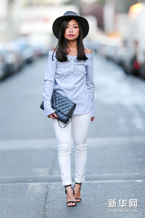 时尚博主May Berthelot街拍。她头戴Maison Michel黑色软呢帽,身穿New Look蓝色波点条纹印花一字肩衬衫,下穿Topshop白色紧身牛仔裤,手拎Chanel黑色菱格纹链条包,脚踩Asos黑色一字带高跟凉鞋。 (图片来源:视觉中国)