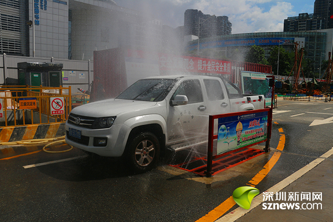 施工单位还利用潜水泵加压给水管对车辆进行自动冲洗,让施工车辆“清爽出门”,有效防止施工车辆对城市环境的污染。同时,冲洗后的污水经排水沟回流到三级沉淀池内,经过沉淀处理后进入清水池,使水资源循环利用,从而达到保护环境又节约成本的目的。