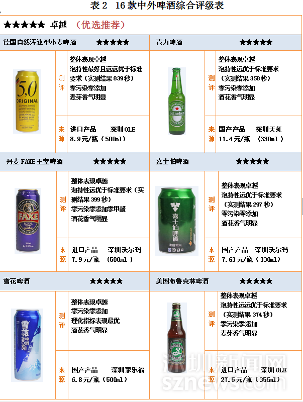 16款中外啤酒中,6款评级五星,国产与进口各3款,分别为:德国自然浑浊型小麦啤酒 、喜力啤酒 、丹麦FAXE王室啤酒 、嘉士伯啤酒、 雪花啤酒、美国布鲁克林啤酒。获得四星评级的有6款,国产5款进口1款,4款三星评级均为进口啤酒。另外,16款中外啤酒均未出现违规使用添加剂和污染物超标情况,均符合国家食品安全标准,甲醛含量均优于国标要求。
