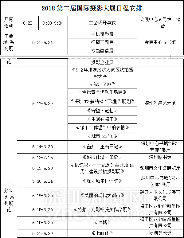 大展把深圳会展中心6号馆作为主展馆,馆内设“征稿主题展”“手机摄影展”“专题邀请展”“摄影企业展”“主题研讨会”五大板块,同时在全市各区设立26个互动性分会场平行展。