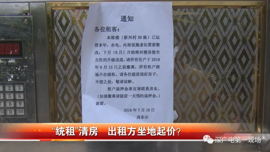 在赵先生家附近,记者找到了这个名为新兴村的城中村,在其中一栋楼房的入口处贴着一张告示,上面写道,由于房屋水电设施老化,所以需要整改,8月15日之前所有住户都得搬离,所有租户都不再续租,落款写的是房东。