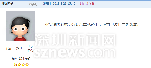 就此,网友“香满楼”吐槽相关部门只管建设,不管维护保养。网友“深圳西站”同时反映,深圳公共汽车站台上,还有很多地铁路线图是二期版本。