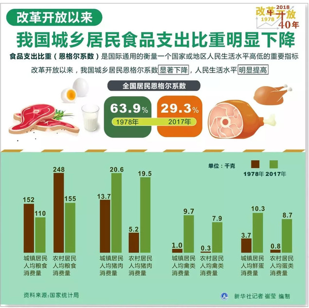 ② 国家统计局数据显示,改革开放以来,我国城乡居民食品支出比重明显下降。