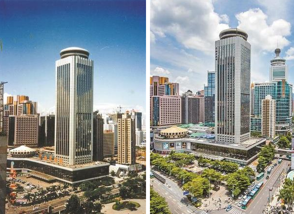 深圳国贸大厦发展对比。(左图为上世纪80年代资料图片)