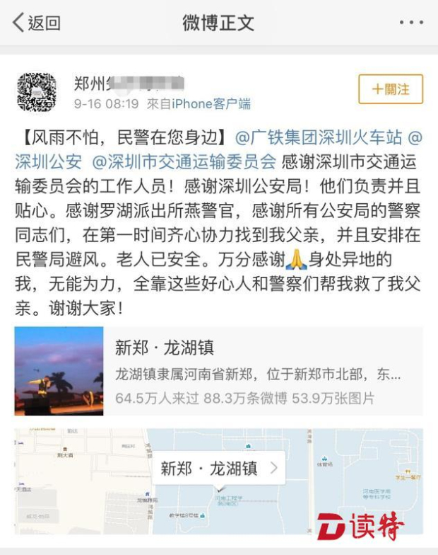 原标题:台风天老人坐不上火车,和在河南的女儿失联!深圳警方彻夜寻找