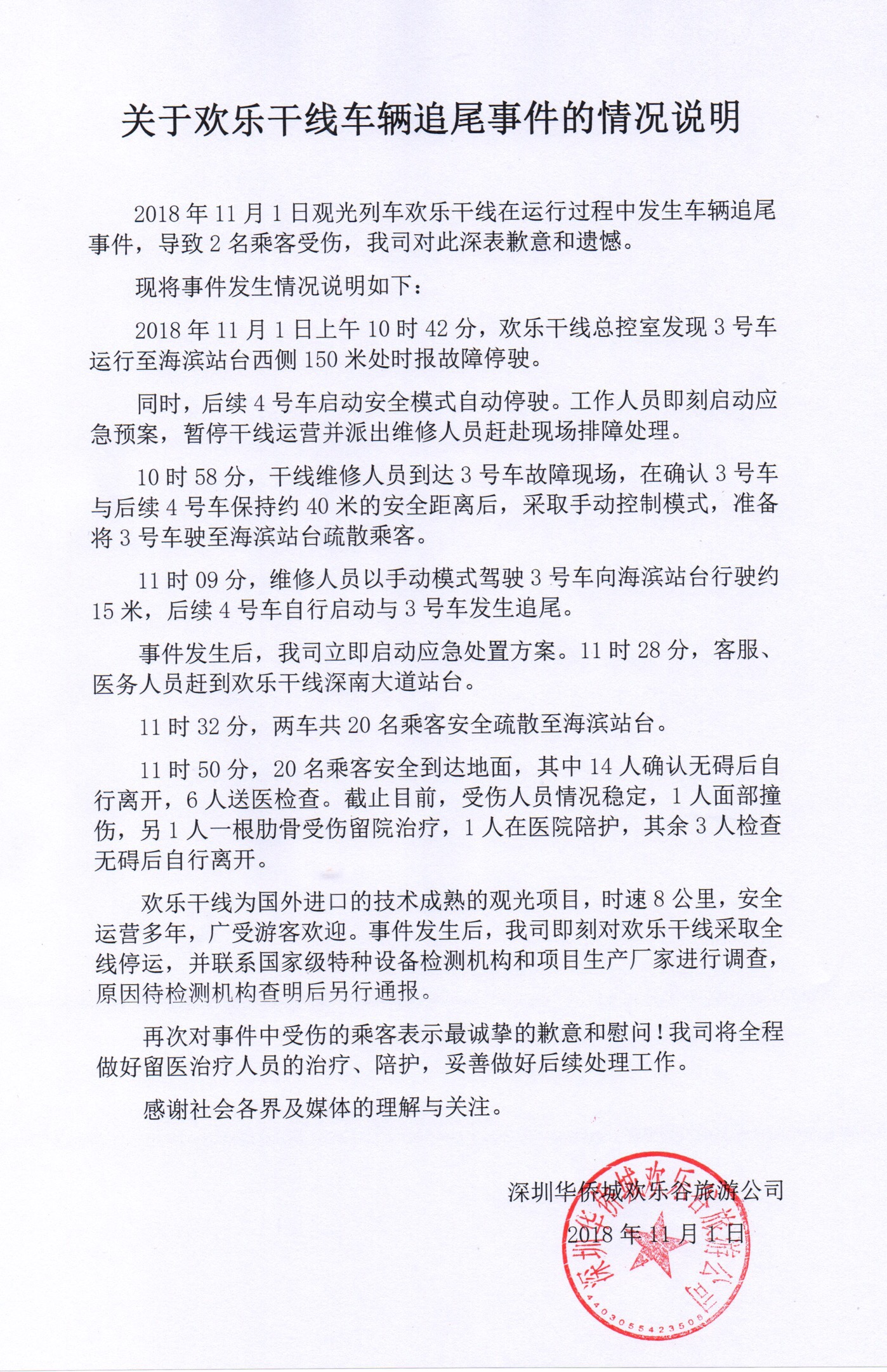 11月1日19时,记者收到深圳华侨城欢乐谷旅游公司就此次事件发来的情况说明。欢乐谷旅游公司在说明中还原了事故发生的过程,并对受伤乘客表示歉意。