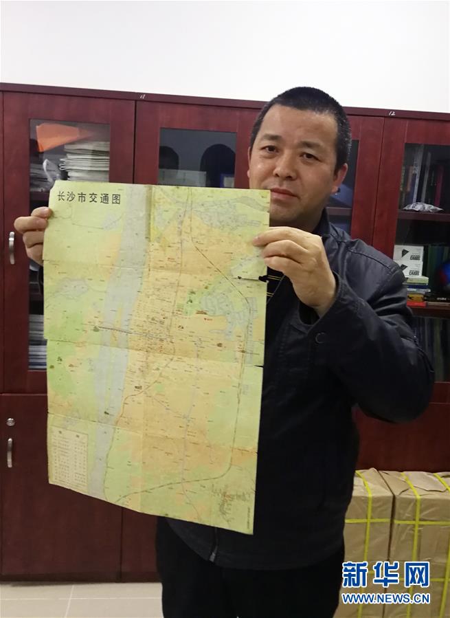 10月23日,蒋连军向记者展示他收藏的改革开放初期的长沙城区地图。 湖南地图出版社注册测绘师蒋连军爱好地图收藏,累积了40多张40年来多个版本的长沙城区地图。10月23日,记者看到了这些地图,它们直观呈现了改革开放40年来长沙城的变迁发展。 新华社记者 段羡菊 摄