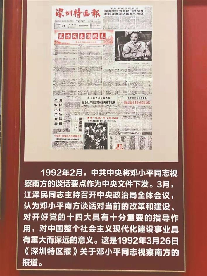 ▲展览展出的1992年3月26日刊登长篇通讯《东方风来满眼春》的《深圳特区报》头版图片。