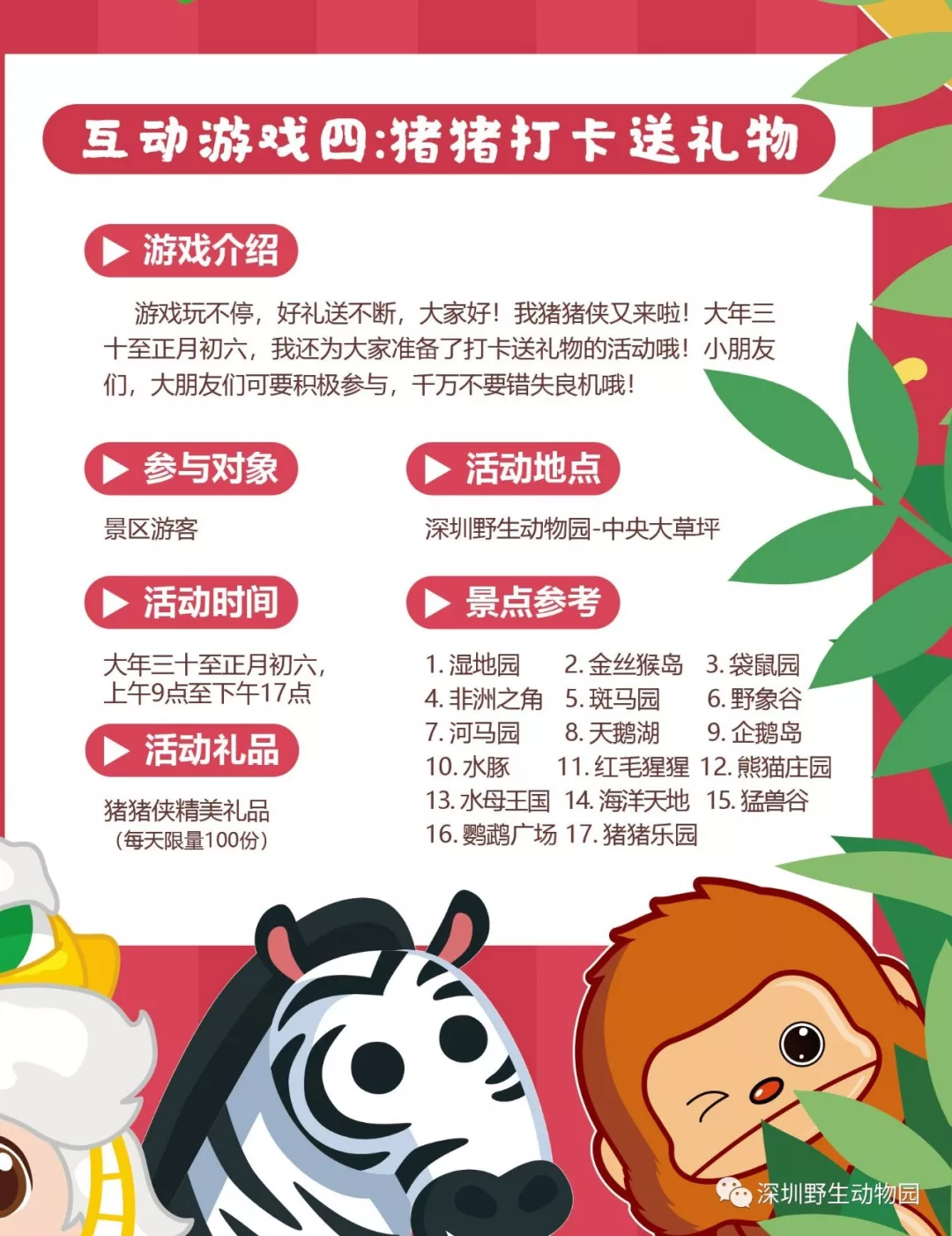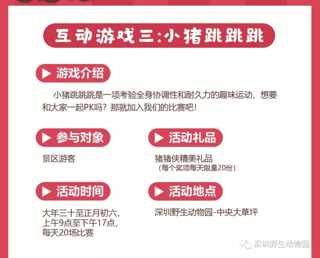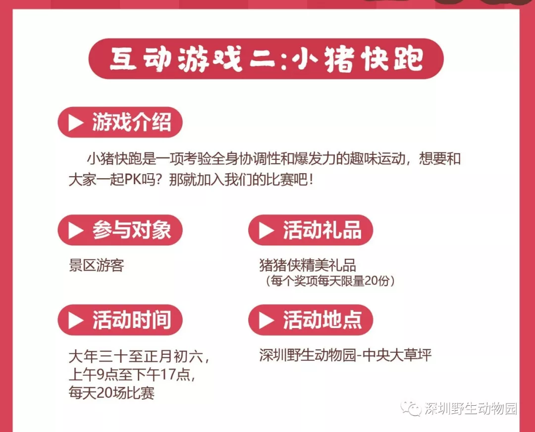 猪年新春新亮点:猪年新生命,新伙伴隆重加入动物王国,点缀出新春最闪耀的色彩;别出心裁猪年猪科普展,带你挖掘猪猪的“前世今生”;美不胜收深圳本土生物多样性科普摄影展,换个角度了解我们身边的动物朋友。