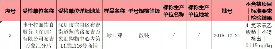 食用农产品也有1批次检出不合格,不合格样品为绿豆芽,不合格项目为4-氯苯氧乙酸钠。