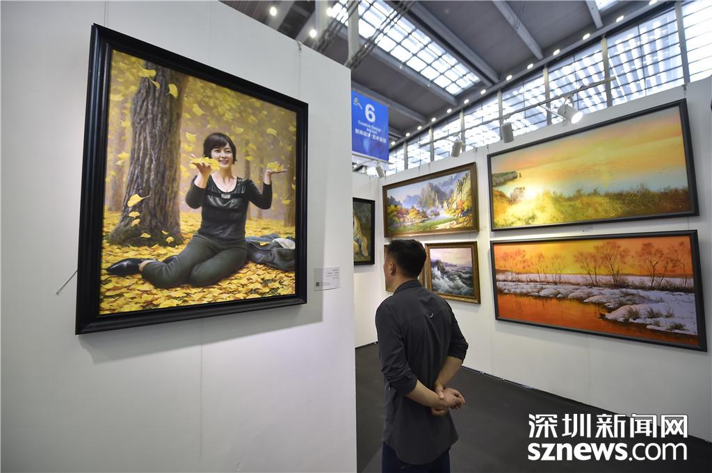 会展中心6号馆,一位市民正在欣赏画作