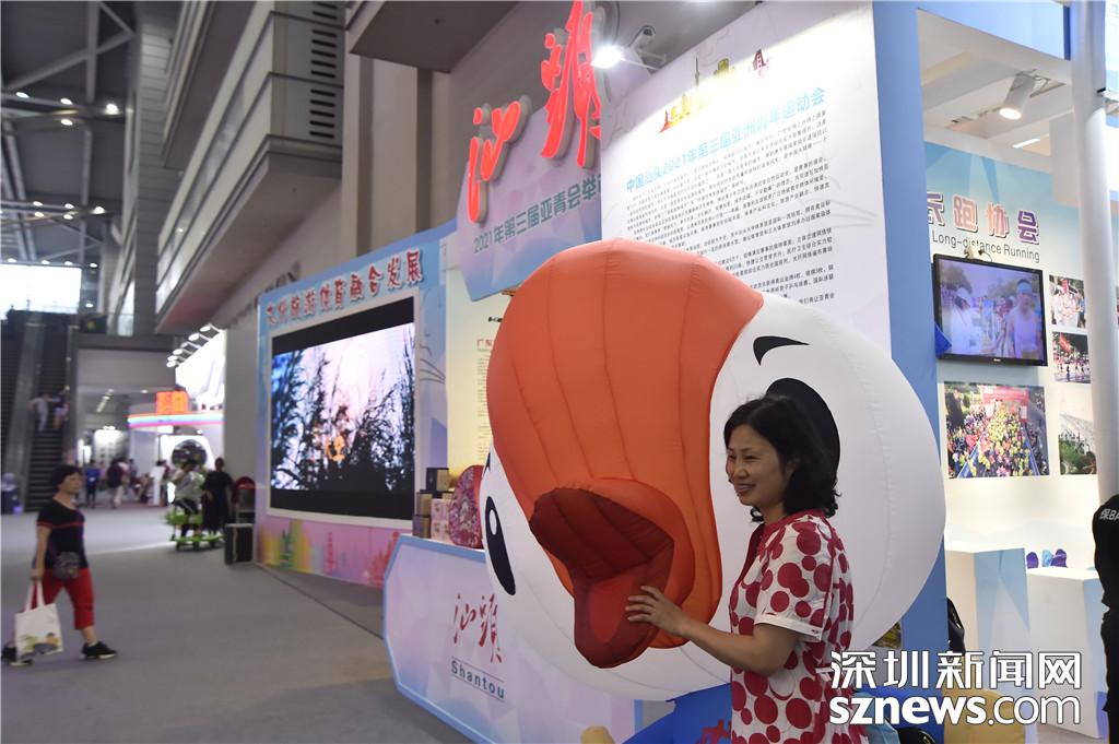 汕头市展区前,市民与吉祥物合影留念