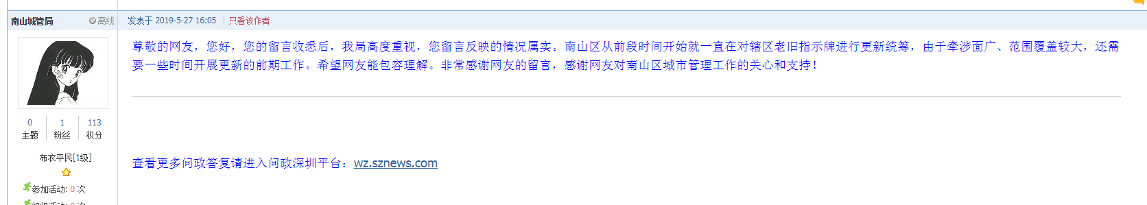为及时解决网友疑问,5月27日下午,南山城管局在网友“syh19667288”发布的帖文下给予回复称需要时间来开展更新工作。具体回复如下: