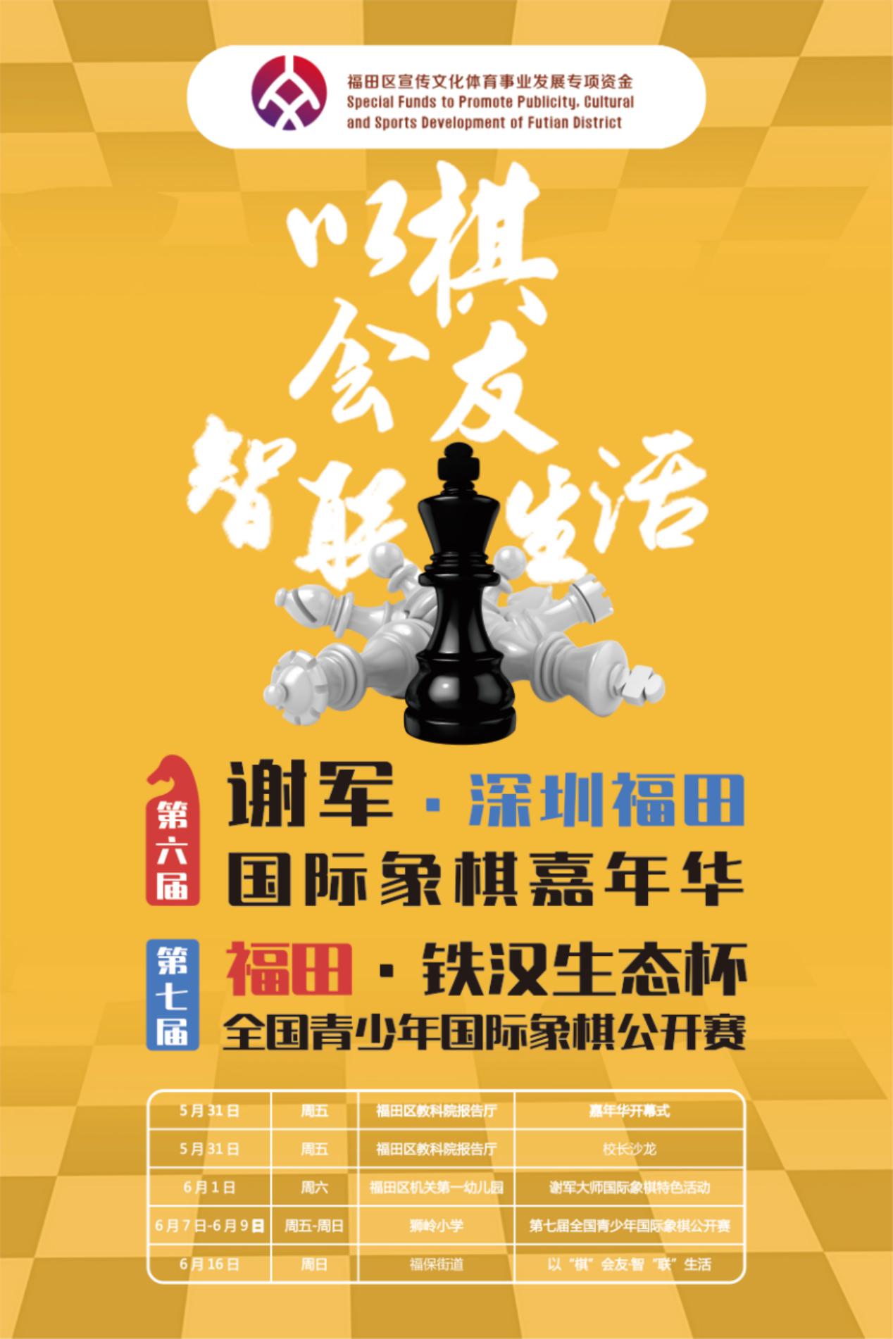 深圳新闻网5月29日讯 福田区一年一度的体育盛事——2019年第六届“谢军•深圳(福田)国际象棋嘉年华”暨第七届“福田•铁汉生态杯”全国青少年国际象棋公开赛即将于2019年5月31日在福田区教科院附属小学隆重开幕。
