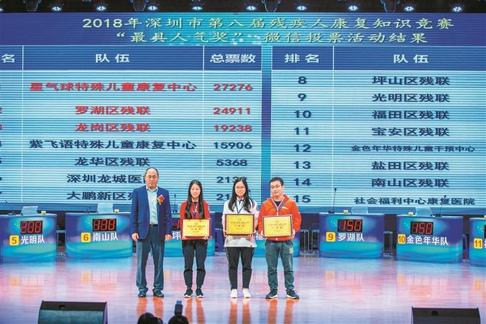 ▲2018深圳市第八届残疾人康复知识竞赛,王坚为获奖单位代表颁奖。