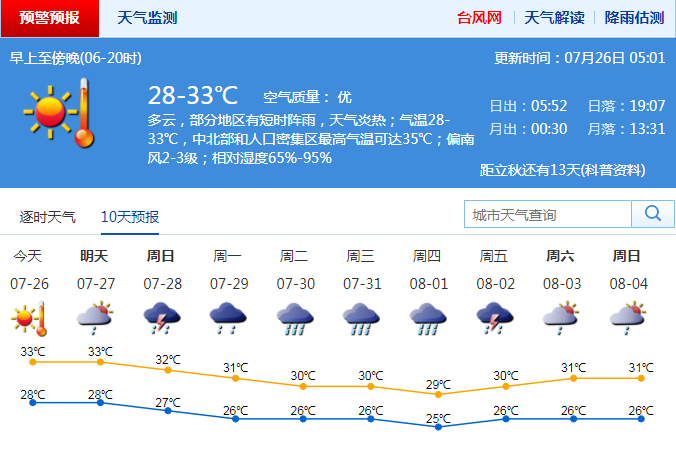 记者从市气象台获悉,受副热带高压影响,26日多云,局部有短时阵雨,气温28~33 ℃,局部最高35 ℃;27日多云,部分地区有短时阵雨或雷雨,天气炎热;28日有雷阵雨,伴有短时强降水和6~8级短时大风;29日有雷阵雨,局部大雨;30~31日有一次明显降雨过程。