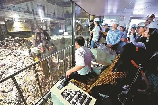 市民近距离参观垃圾处理抓钩操作室。