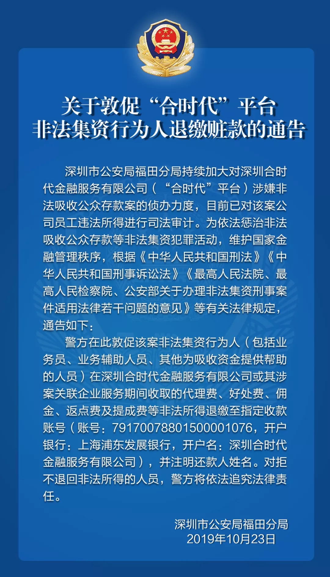 关于敦促“合时代”平台非法集资行为人退缴赃款的通告