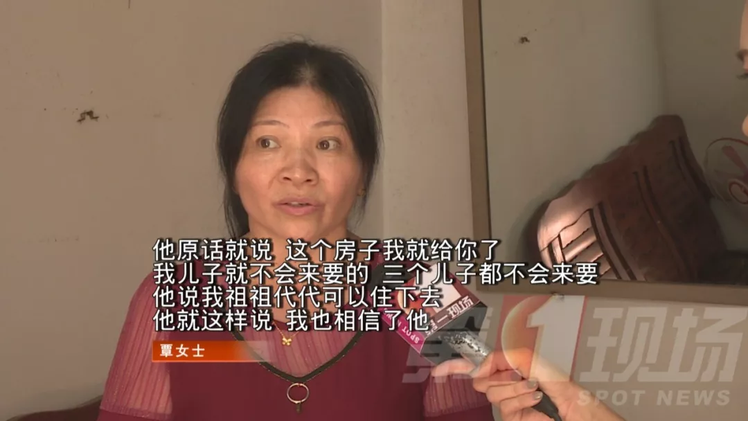 覃女士说,在照顾黄先生期间,相处的挺愉快,只是好景不长,黄先生在一次意外中摔倒,并于2002年离世。覃女士告诉记者,临终前黄先生为了报答她的照顾,曾承诺将自己住的房子无条件给覃女士居住。