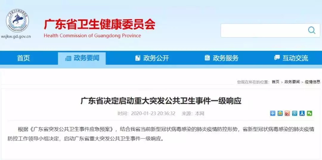 广东省卫健委1月23日晚发布通告:根据《广东省突发公共卫生事件应急预案》,结合我省当前新型冠状病毒感染的肺炎疫情防控形势,省新型冠状病毒感染的肺炎疫情防控工作领导小组决定,启动广东省重大突发公共卫生事件一级响应。