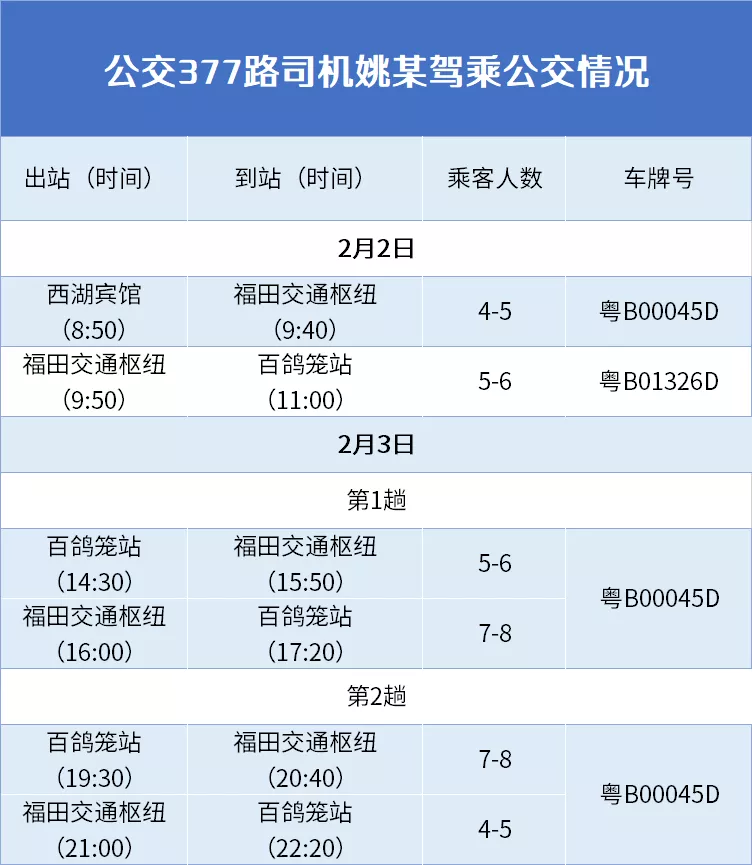 2月2日上午,姚某到车队报到,按照公司疫情防控工作规定,经体温检测正常后,车队安排姚某随377路跟班一趟(先后搭乘2台车,分别是粤B00045D、8时50-9时40分、粤B01326D、9时50-11时)共约2小时,期间先后同车乘坐乘客11名。车载视频显示,姚某多数时间坐在公交车中后部,并佩戴口罩。
